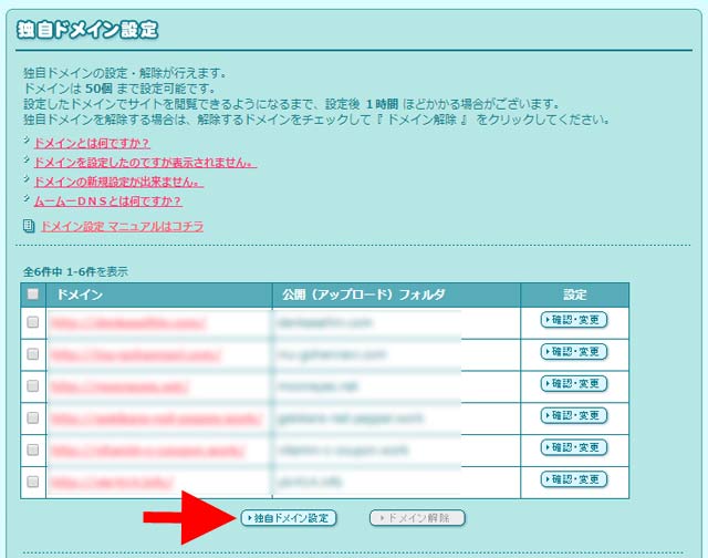 新たに独自ドメインを追加するには、下部に表示されている「独自ドメイン設定」ボタンをクリックしてください。