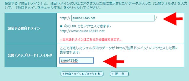 設定したい独自ドメインと公開フォルダを入力し、下部の「独自ドメインをチェックする」をクリックすると、確認画面が表示されます。