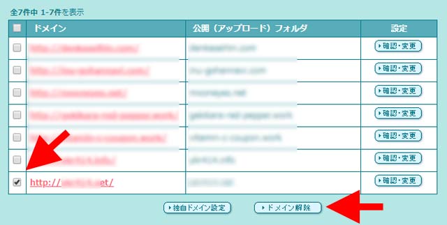 独自ドメイン設定画面で、削除したいドメインの左側にあるチェックボックスにチェックを入れ、