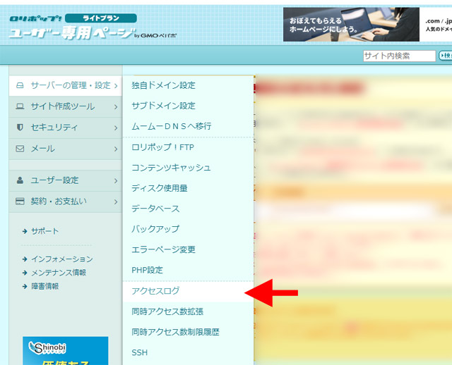 アクセスログは、運営しているサイトのアクセス数などを確認できる項目です。