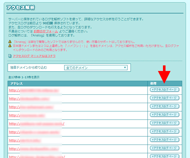 アクセス情報を調べたいサイトの横に表示されている、「アクセスログページ」ボタンをクリックします。