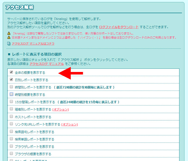 転送量を調べるだけであれば、一番上の「全体の概要を表示する」にチェックを入れるだけでOKです。