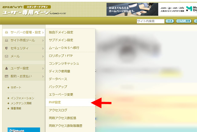 左メニューにある「サーバーの管理・設定」より、PHP設定を選択します。