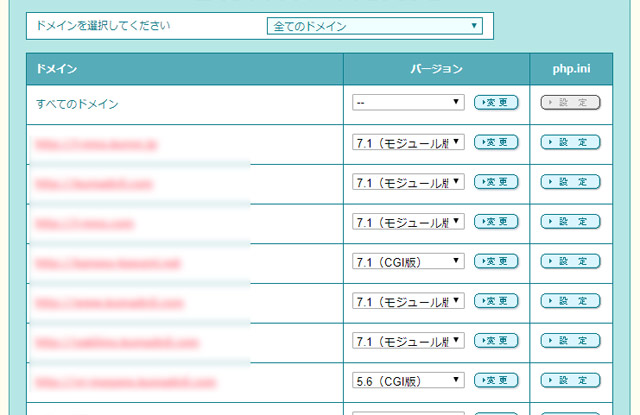 この画面では、登録している独自ドメインおよび作成したサブドメインと、それぞれのドメインで使われているPHPのバージョンが表示されているはずです。