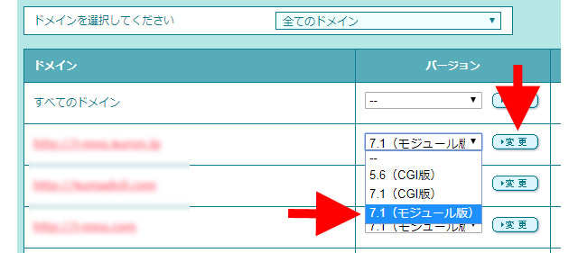 PHP設定をモジュール版へ変更したい場合は、変更したいドメインの隣にあるプルダウンメニューを開き…