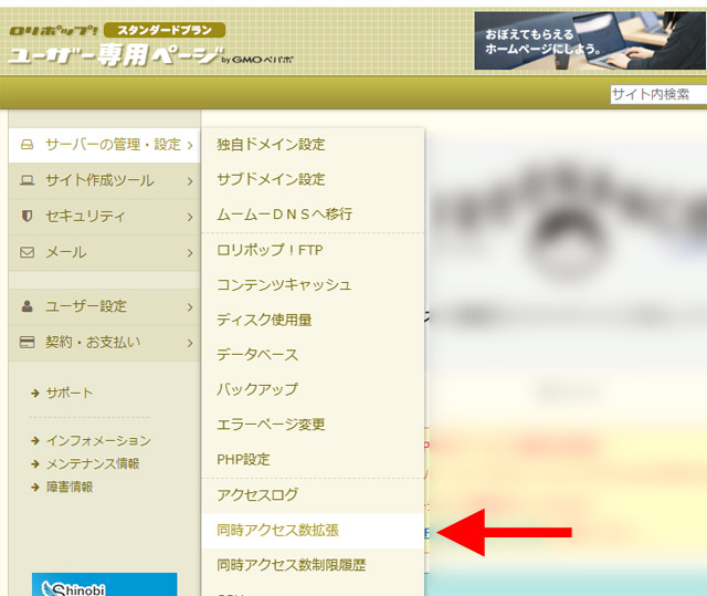 左メニューにある「サーバーの管理・設定」より、「同時アクセス数拡張」という項目を選びます。