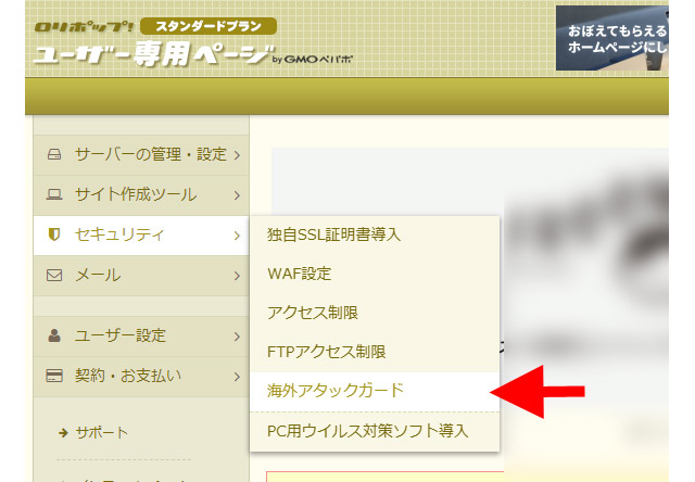 左メニューにある「セキュリティ」より「海外アタックガード」という項目を選択してください。