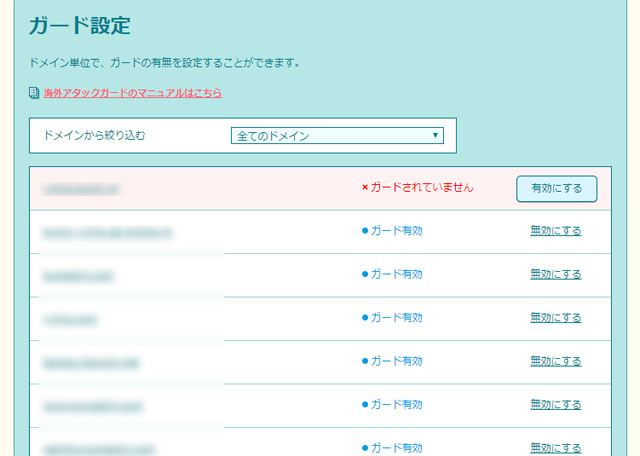 サブドメインごとに海外アタックガードの有効・無効を設定できるようになっています。