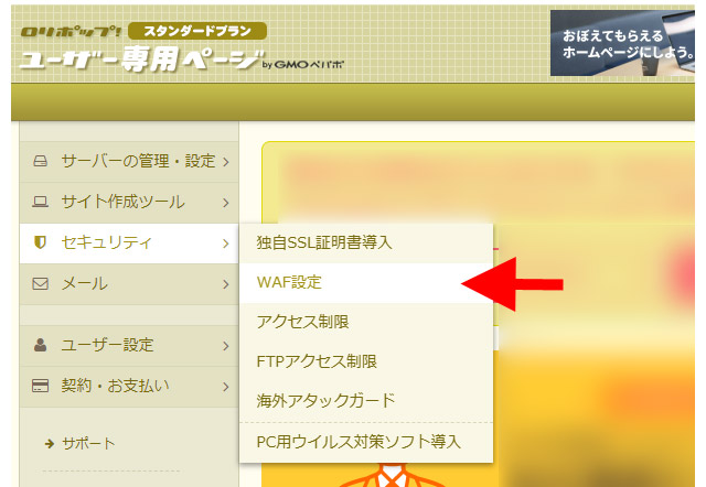 まずはユーザー管理ページへログインし、左メニューにある「セキュリティ」>「WAF設定」をクリック。