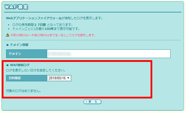 ユーザー専用ページの「セキュリティ」>「WAF設定」>対象ドメインの「ログ参照」より、WAF検知ログをみることが可能です。
